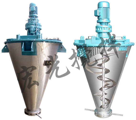 單錐雙螺旋錐形混合機(jī),它由傳動(dòng)部分、筒蓋、螺旋、筒體、出料閥等組成。